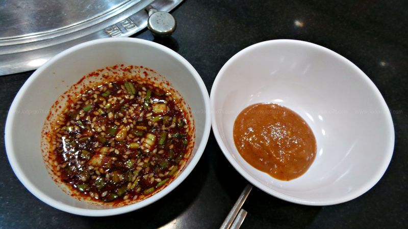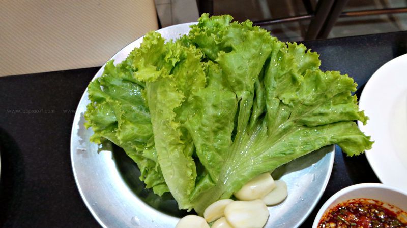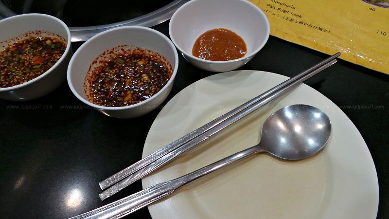 ส่วนน้ำจิ้มจะมีมาให้ 2 แบบ มีคล้ายๆจิ้มแจ่วแต่สไตล์เกาหลี และแบบเป็นซอสสีแดง เราชอบแบบจิ้มแจ่วเกาหลี และตะเกียบเป็นแบนๆแบบนี้ซึ่งเราใช้ไม่ถนัดเท่าไหร่ และก็จะมีผักกาดหอมมาให้ พร้อมกระเทียมแกะเสร็จสรร 1 จาน ขอเพิ่มไม่ได้ด้วยเช่นกัน ต้องจ่ายเงินเพิ่ม