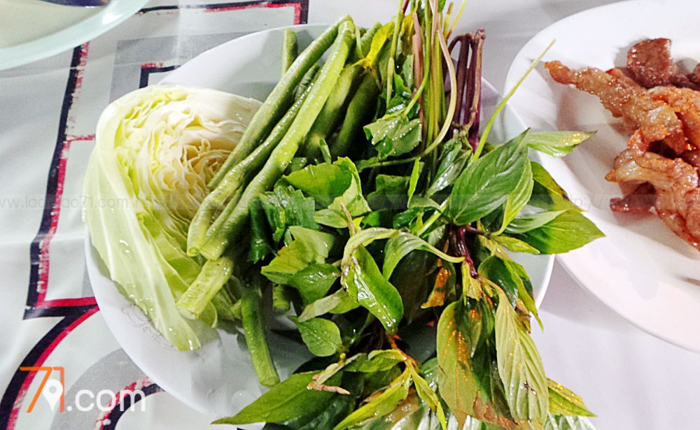 เมื่อมานั่งที่โต๊ะแล้วต้องใจเย็นๆนะครับ ไม่ต้องใจร้อน เพราะว่าเมื่อคนเยอะแล้ว ทุกอย่างจะช้าไปหมด แต่ก็รอร้อรอได้เพื่อความอร่อย จะได้ผัก(ตามรูป)มา 1 จาน เมนูแรกที่มาก่อนคือ “หมูแดดเดียวทอด” ไม่แห้งนะ ชุ่มฉ่ำ ติดมันนิดๆ เอาเป็นว่า วางปุ๊บ หมดปั๊บ จานนี้ 60 บาท ถ้าเป็น เนื้อแดดเดียวทอด 100 บาท