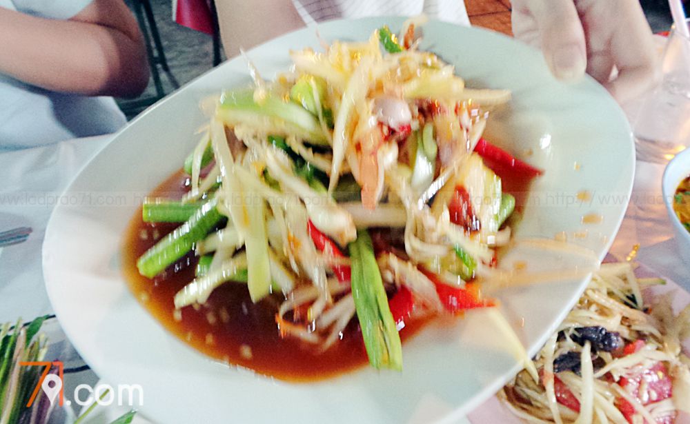มาถึงเมนูส้มตำกันบ้างกับจานแรก ตำปูปลาร้า(ไม่เผ็ดนะจานนี้) สีดูจืดๆ แต่กลมกล่อมดี จานนี้ 30 บาทเท่านั้น ส้มตำจานต่อมา “ส้มตำกุ้งสด” จานนี้ 60 บาท