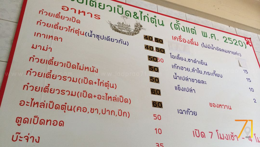 ราคาก๋วยเตี๋ยวเป็ดตุ๋นไก่ตุ๋นร้านนี้จะอยู่ที่ชามละ 40-60 บาท มีตูดเป็ดทอดขายจานละ 10 บาท และร้านนี้ไม่ขายน้ำอัดลม