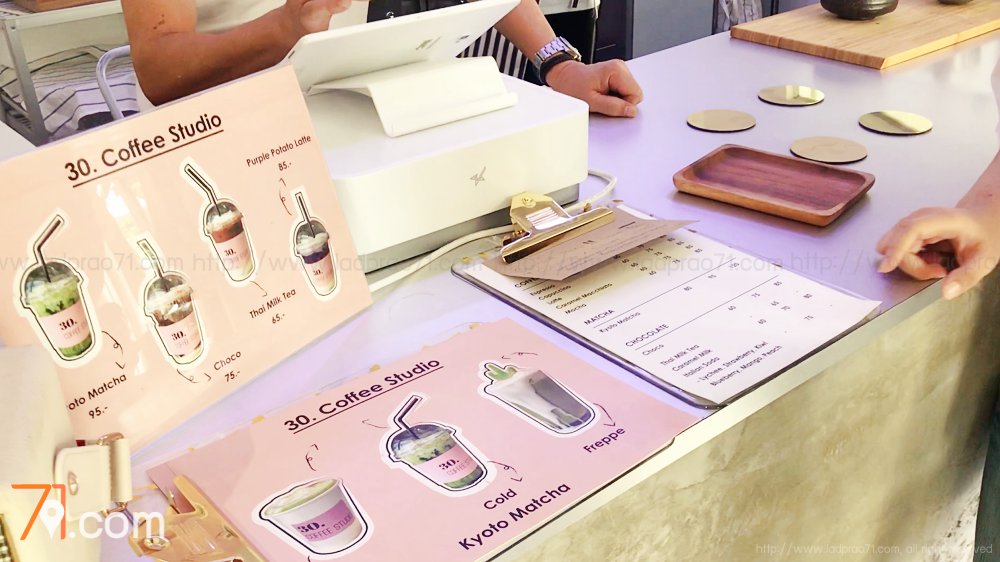 สำหรับเมนูเครื่องดื่มมีราคาโดยประมาณ 60-90 บาท เป็นเครื่องดื่มประเภทชา-กาแฟ แต่ที่ได้รับความนิยมจะเป็น “Kyoto Matcha” ไม่ว่าจะเป็นร้อน เย็น หรือปั่น ก็ถูกพูดถึงความเข้มข้นหวานมัน ของที่ 30.Coffee Studio หรือจะเป็นเครื่องดื่มสีน่าทานอย่าง “Purple Potato Latte” มันม่วงผสมนมสดรสชาติออกหวานๆมันๆ