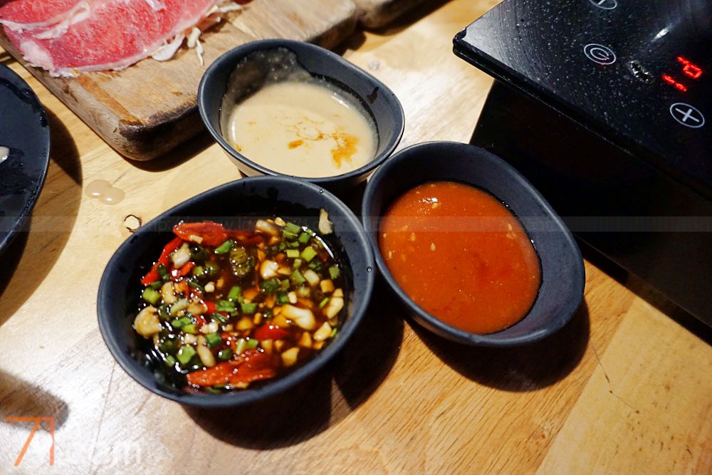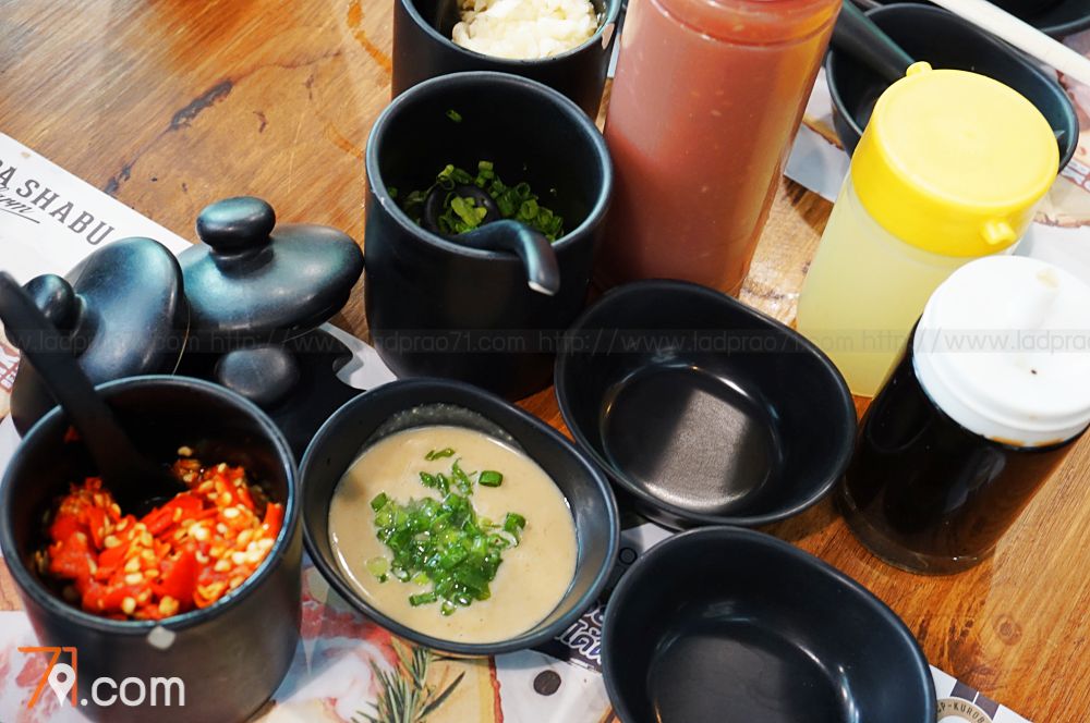 น้ำจิ้มสูตรปาป้า ชาบูฟาร์ม มี 3 อย่างได้แก่ น้ำจิ้มงา น้ำจิ้มสุกี้ และน้ำจิ้มพอนสึ เราสามารถเพิ่มรสชาติด้วย พริกขี้หนู น้ำมะนาว ต้นหอม ปรุงได้ตามความชอบ